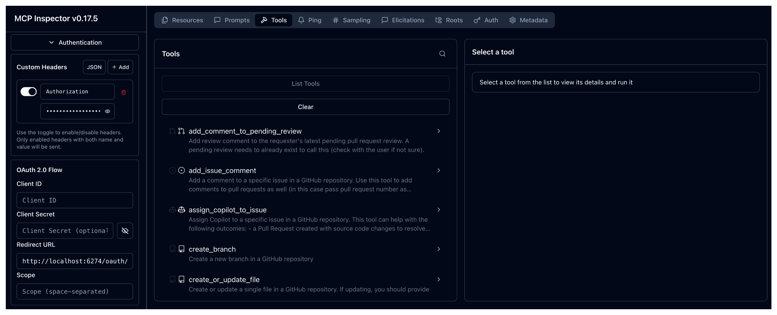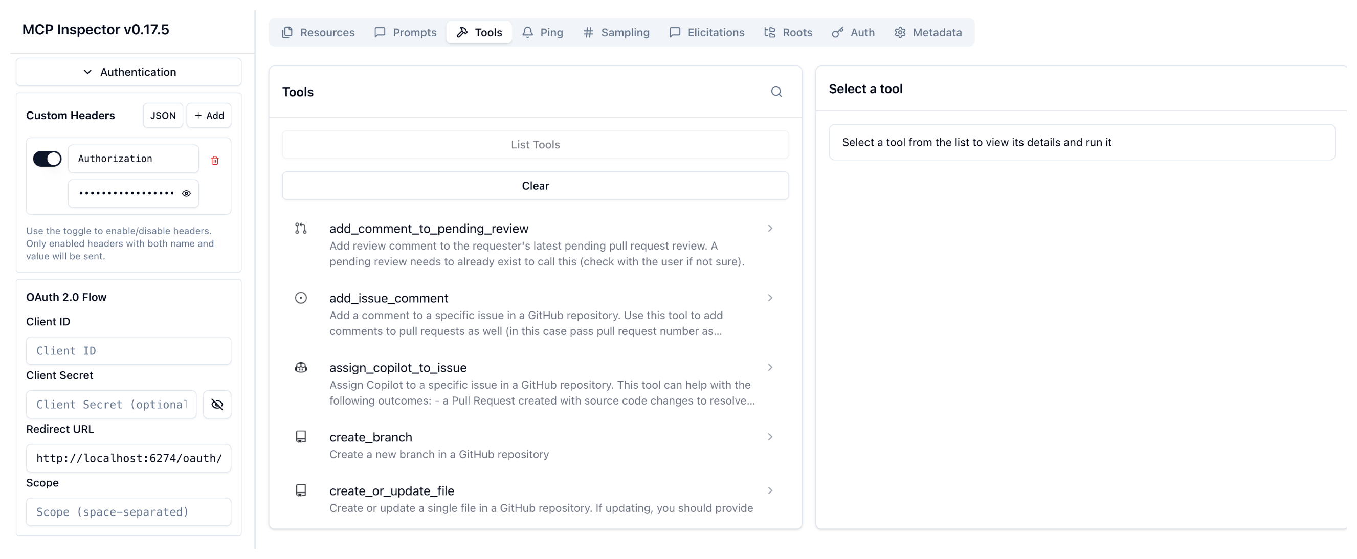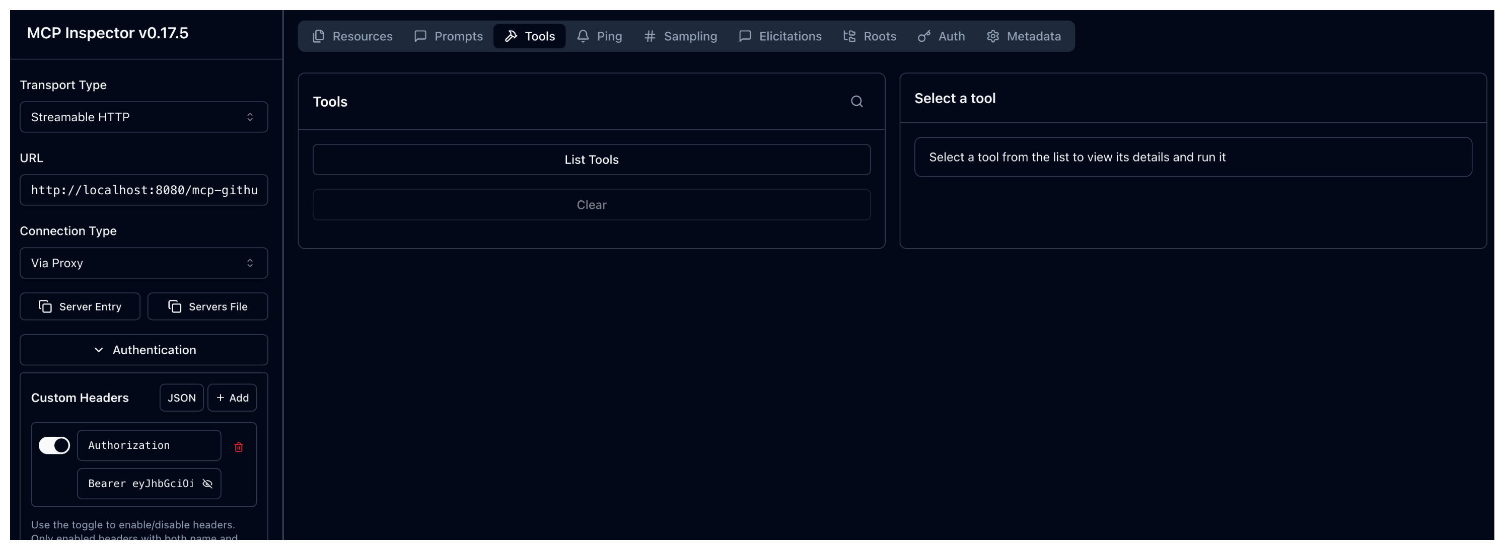 1. Go back to the MCP Inspector tool and expand the Authentication section. Enter the following details in the API Token Authentication card: